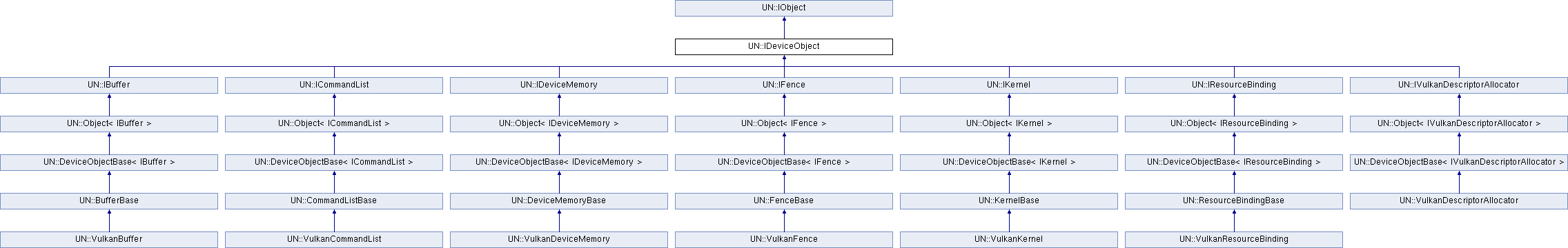 Implemented in UN::VulkanBuffer, UN::VulkanCommandList, UN::VulkanDescriptorAllocator, UN::VulkanDeviceMemory, UN::VulkanFence, UN::VulkanKernel, and UN::VulkanResourceBinding.