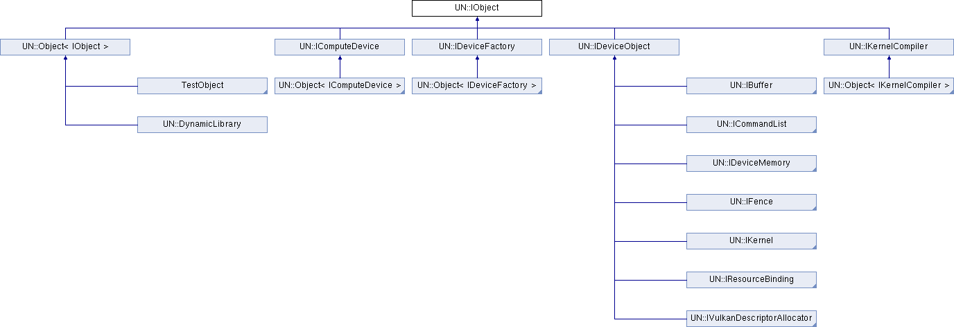 Implemented in UN::Object< IObject >, UN::Object< IBuffer >, UN::Object< ICommandList >, UN::Object< IDeviceMemory >, UN::Object< IFence >, UN::Object< IKernel >, UN::Object< IKernelCompiler >, UN::Object< IResourceBinding >, UN::Object< IComputeDevice >, UN::Object< IVulkanDescriptorAllocator >, and UN::Object< IDeviceFactory >.